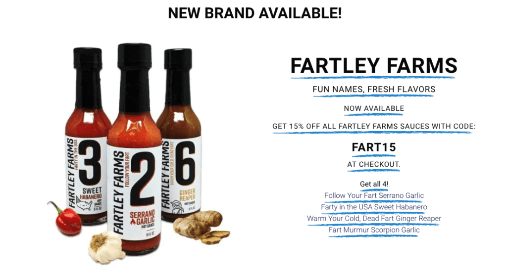 Exciting news, we are now in the online store for Flower City Flavor Company! Along with all four of our Fartley Farms hot sauces, Flower City Flavor Company has 175 other sauce and condiment items available on their site. With 68 brands of hot sauce, you can now get Fartley Farms and a host of others in one convenient spot. Other brands include Karma Sauce, Jersey Barnfire, Angry Goat Pepper Co, High River Sauces and many more.