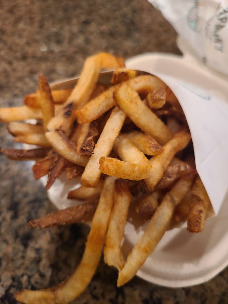 Everything looks more inviting in the snow. Sitting on the corner of East Frankfort and South 3rd in German Village is a cozy diner-esque restaurant that opened in August of 2020. We’ve got a huge amount of respect for anyone that opens a restaurant mid-pandemic and Champan’s Eat Market is included on that list. Taking a different approach than most restaurants, Chapman’s Eat Market is using the pandemic to their advantage, taking reservations, but in-house diners will be treated to an 8-course Tasting Menu, with the menu not being released until 24 hours prior to your visit. It’s a cool take on getting to cook more seasonal offerings that we’ve not seen anywhere else. Their upcoming seasonal menu at the end of February is a “Journey through Vietnam” from Chef Matt Larkin. Sounds pretty darn tasty. https://www.instagram.com/p/CLEmWH2D9GT/ Outside of food, Chapman’s Eat Market also does their part to give back to the community, featuring a “Partnership of the Quarter.” This quarter they are teaming up to support the Children’s Hunger Alliance and assist the “more than 510,000 children across Ohio that live in food-insecure households.” The backgrounds of all those cooking at Chapman’s Eat Market is evident in their rotation of foods as well as their highlighted dishes/features on Instagram. Takeout and delivery are also available to folks, and Chapman’s continues to add, swap, and update foods on the menu. They also have a broad selection of “to-go” cocktails to choose from, and their own pints of ice cream including Cranberry-Orange-Almond and Chocolate Chip Cannoli to name a few. On this particular visit, we were rolling up for two dishes, the Spicy Karaage Chicken Sando and their Roasted Pork Belly Sandwich, a Wednesday special. We also snagged some shoestring fries and ice cream (pints are single-serving size right?).