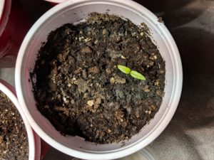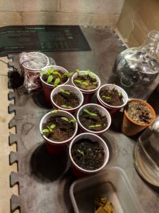 Today I had the magical combination of both time and inclination to do some transplanting. All the peppers seeds except one Carolina reaper have popped up and most have their first set of true leaves. Not all of the peppers are as far along as we’d like, but I wanted to get it all over with at once, so everyone was moving today. Transplanting into separate containers avoids root entanglement and nutrient competition. Earlier in the week I made up several more solo cup planters and set them in a tray of water to soak the soil. Armed with little but a plastic knife I dug each plant out of the crowded cup, making sure to get a chunk of soil with it. This detail avoids disturbing the roots, making for a smoother transition to the new cup. When planting into the new cup, I buried the stem a little. Like tomatoes, peppers adapt to deep planting by putting off roots from the stem, taking up nutrients faster. Before: