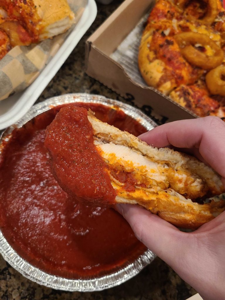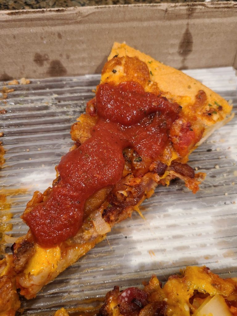 Unsure of what to expect and untrusting of my brain at this point, a handful of fries were the first spicy tester vessels. Several dredged bites in, I noticed a subtle hint of heat. It’s a direct on your tongue heat with a bit of sweetness to it, making it a great compliment to the chicken parm. A few more tests of the sauce and same thing, slight tongue heat, a little sweetness, then gone. The Lady of the Farm dipped in a fry, same cycle. Tongue heat, sweet, gone. If I had to guess the pepper powder used, I’d lean toward cayenne, smoked paprika, or maybe a hint of serrano. Fully tested, I thought of where it sat on our list. As a pizza sauce and dipping sauce, I enjoyed my time with the Howlin’ Hot, but it could definitely use some extra kick (I ended up adding some Scorpion Garlic sauce to it later). As such, we’re placing Hounddog’s Pizza at #120 on our list, in the lower echelon of spicy items, giving it a stamp of approachable for any tolerance level over the base.