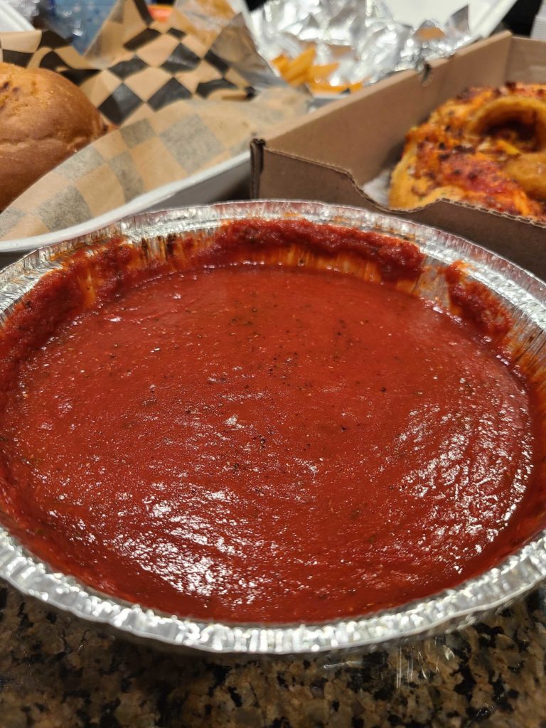 As part of their sauce list, sitting high atop the 5-sauce scale is the “Howlin’ Hot” sauce, which notifies you is HOT! on the menu. Along with a cheeseburger pizza and chicken parm, we got a side of the Howlin’ Hot, just in case it was too much for The Lady of the Farm. Dumb brain again was like “I bet it’s a little side cup.” WRONG. Hounddog’s gives you a massive container full of their sauce. I dipped in my fries, I dipped in the chicken parm, I slathered it on the pizza and still there was more. It was like a Mary Poppins container of sawce.