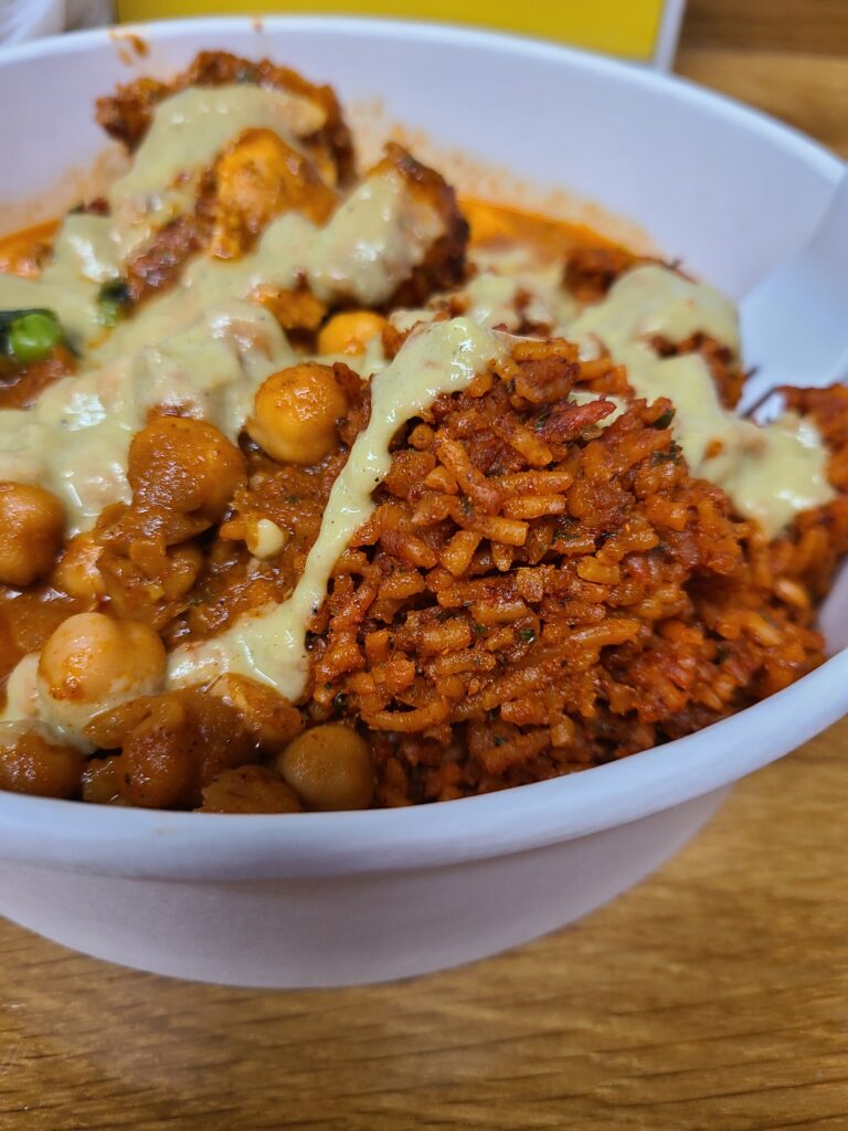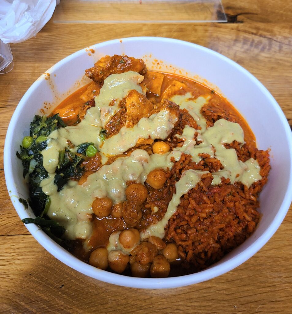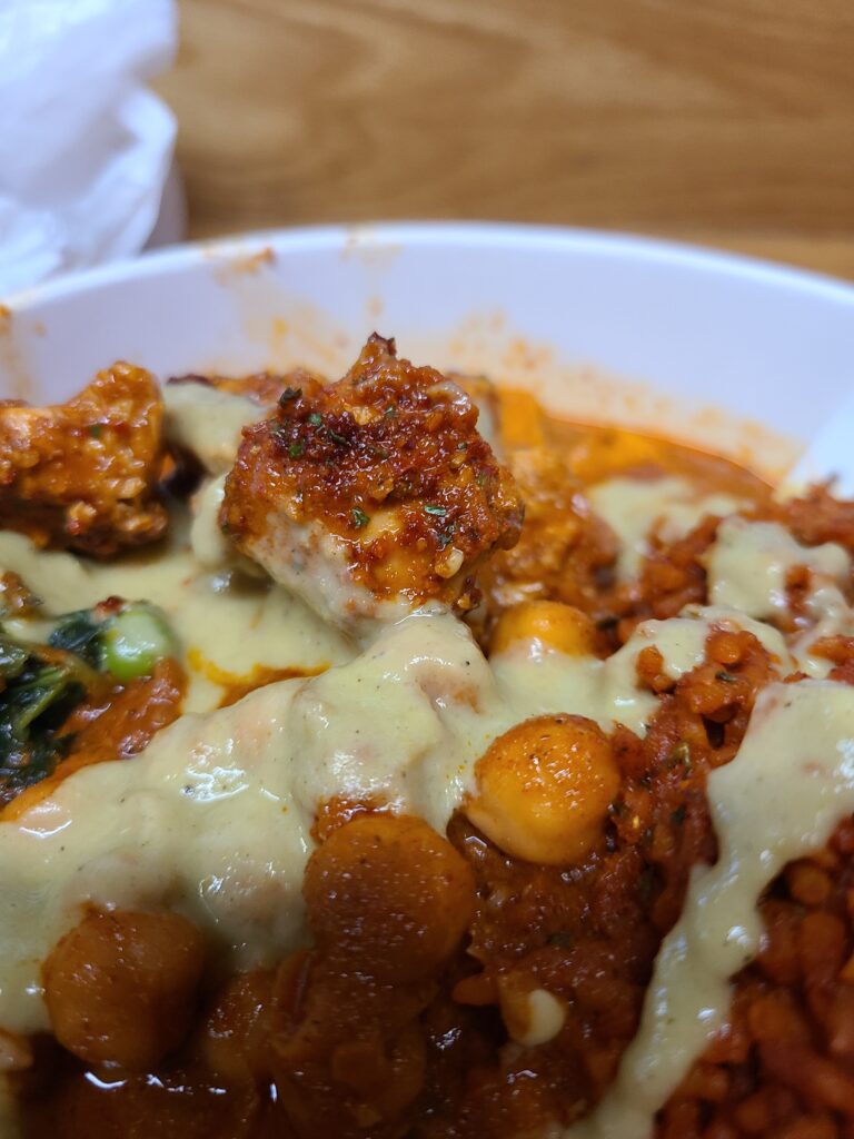 The rice has that slow build with heavy cumin and spices that give way to the eye-watering heat. There’s an addictive tingle that keeps you diving back in for more and honestly, I think I could eat a bucket of this rice. Nose running, I glanced around the upper deck of North Market, making sure no one would see the disgusting spice gremlin I was turning into. Veggie-wise, the spinach doesn’t do much in terms of heat, but with the chickpeas and the hot sauce mixed in, another version of heat started to creep through. A more traditional front-of-the-mouth spiciness, the original hot sauce has a bit of the vinegar bite, then a sharp heat that falls off, leaving the blanket of spiciness the rice affords.