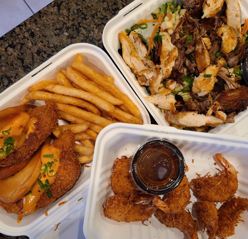 Feast your eyes above on the tasties from Huli Huli. In this corner (bottom left) we’ve got the Chicken Katsu Bao Bun with Bang Bang sauce (listed as mild) with some scallions. A crunchy chicken and a chewy bun, plus a side of fries? Easy choice. Then there’s the coconut shrimp in the bottom right with a cup of dipping sauce that almost tasted like a sweet and spicy thai chili sauce. Well-sized portions, especially for the price ($9.50 and $8.00 respectively). Not featured are any of their drinks, but the drink list includes House Tiki Cocktails like classic Mai Tai, Hurricane, or Zombie, as well as Daiquiris, Old Fashioneds, Beer, Wine, and Non-Alcoholic beverages. Huli Huli even marks the drink strength meter for you so you have a better idea of the level of booziness within. Before we get into the salad, Huli Huli has an easy system of building your meal. First, the proteins: Grilled Shrimp, Kalua Pork, Chicken Katsu, Grilled Chicken, Spam (yes!), Fried Tofu, or Beef Patty. From there you have the option for a Bao Bun, Salad, or Rice, covered in any of their five topping choices: Pineapple Salsa, Pickled Carrots, Spring Mix, Cucumber, and Scallions. Finally, you can top it all with their house-made sauces (more on that below). Your plate ranges from $7.85 to $9.50, with the option to add additional protein for a few extra bucks. As salads go, this one was gigantic. [caption id=“attachment_4513” align=“aligncenter” width=“768”]