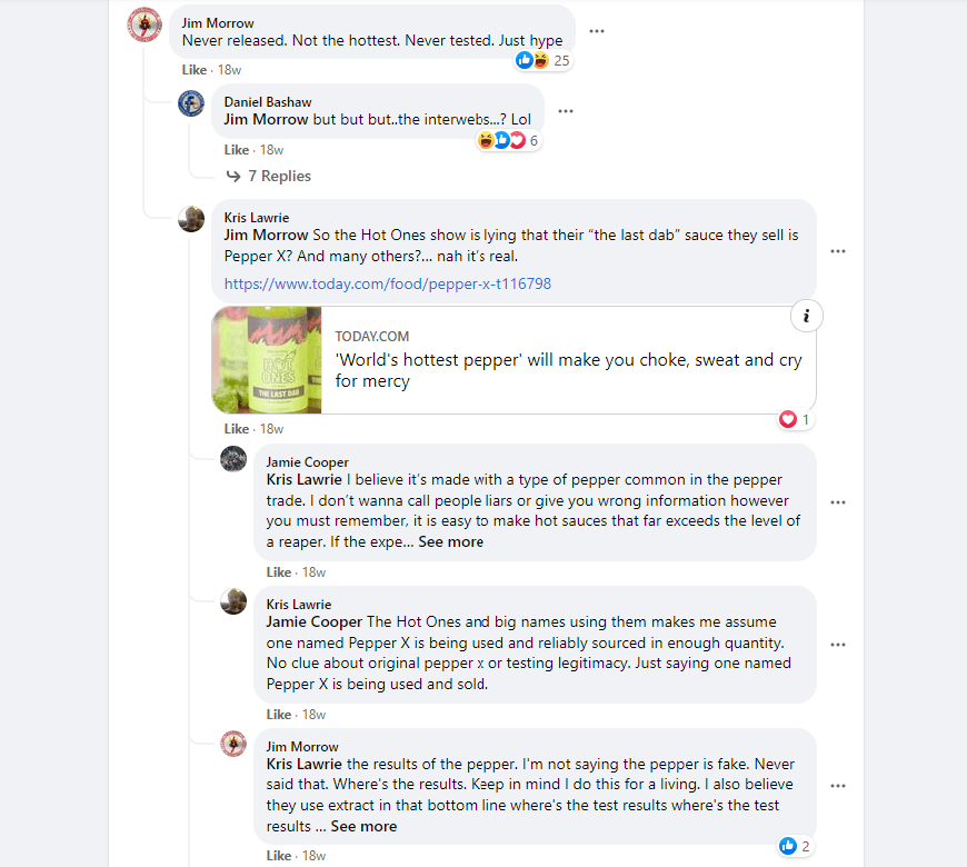 Jim Morrow, well-known in the hot pepper seed community, also weighed in: “I’m not saying the pepper is fake. Never said that. Where’s the results. Keep in mind I do this for a living. I also believe they use extract in that bottom line where’s the test results where’s the test results where’s the test results you can make any claim you want to in the public that’s the same damn crap that they did with dragons breath. The people in England. Where’s the Southwestern laboratories chili institute lab tests. No one has seen them”