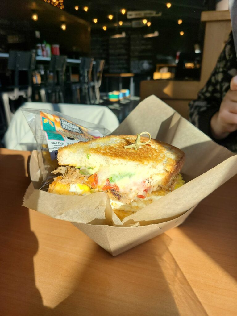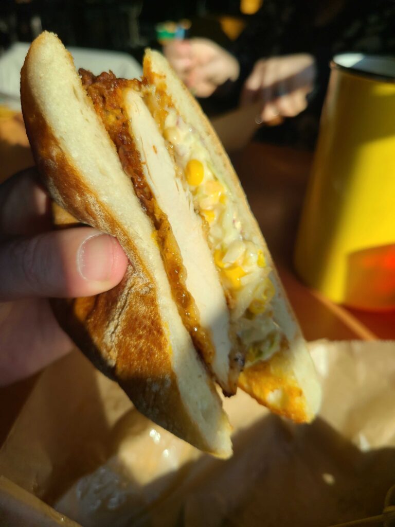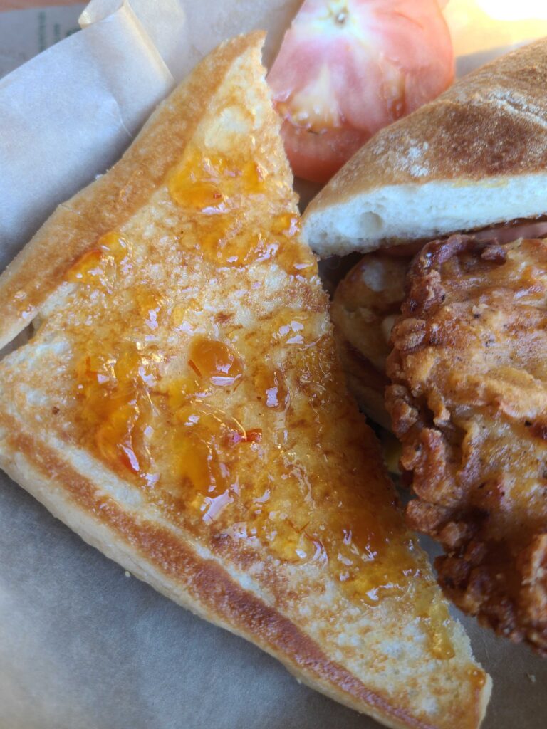 A familiar cayenne-heavy hit from the Nashville Hot Chicken Spices forms a friendly bond with the Peach-Habanero jam that brings a full-mouth heat to the sandwich. The cayenne hits quick and early, but gives way to the sweet, citrusy heat of the peaches and habaneros. A slight linger from the habs, but it’s a sandwich that The Lady of the Farm could comfortably eat. And she tried to. A couple handslaps later she relinquished the second half of the sandwich to its rightful owner so I could continue my spicy investigation.