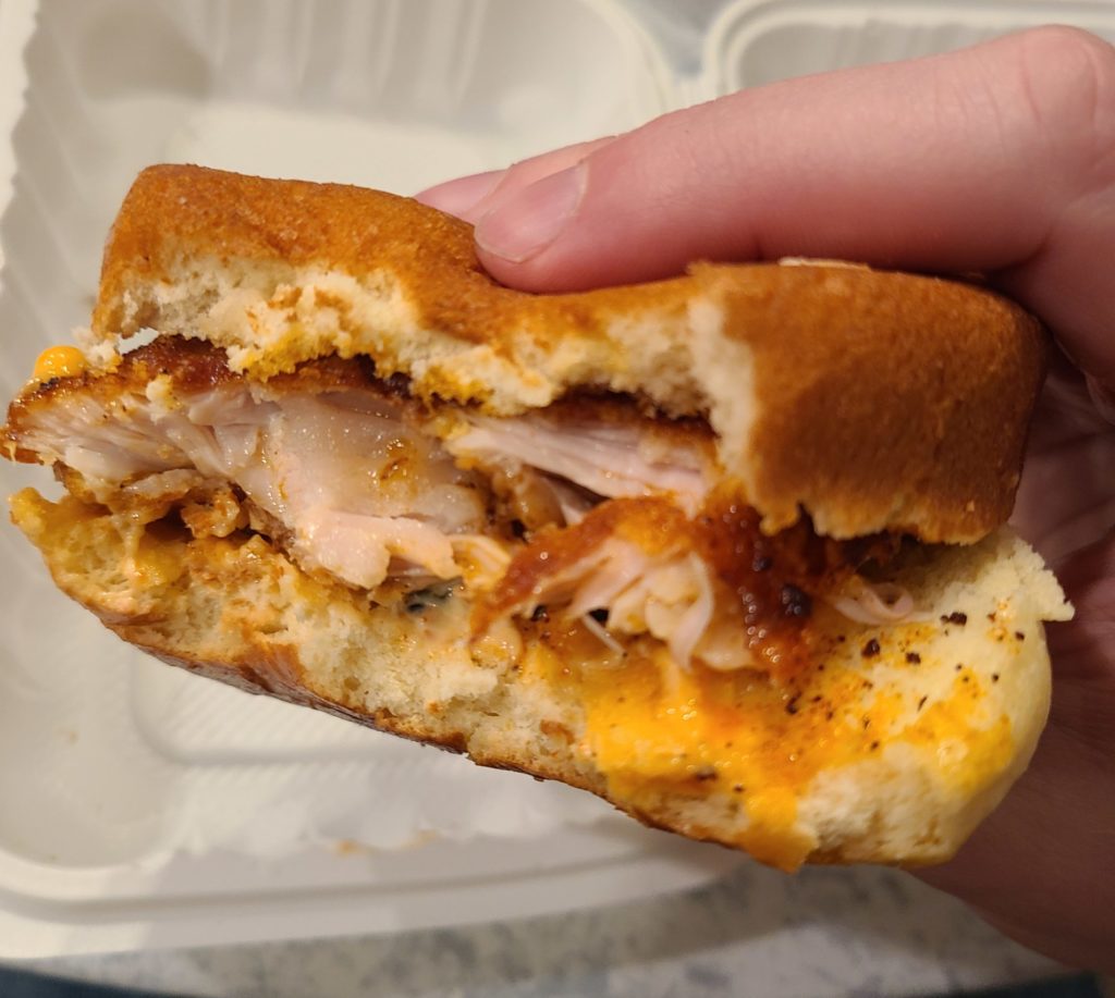 Drooling intensifies.[/caption] “Doing alright?” I half-laughed. “It’s that type of spicy where I can’t stop eating it,” she exhaled. Lower on her list than the Spicy Chicken Stir Fry from Gogi, the Spicy Chikin was definitely getting to her. One note about the pickles, they are there. Nothing that takes away from the heat, but an extra bit of crunchiness. Working through the rest of the sandwich, the spread and consistency of the heat was impressive. It never overwhelms, but is a cozy spice level that will warm you up in the winter without murdering you (a kind change from our top 20). My thoughts were interrupted by a solid nose blow from The Lady of the Farm, “oh yeah, I can definitely feel that one. Whewwww.” When it comes to spicy chicken sandwiches, this one is toward the top of our list (if not number one) for the whole package (flavor, cronch, price, heat), but on our list, it lands at #56, just after Dosa Corner’s Onion and Chili Dosa and right before Xi Xia’s Dapanji Stirred Noodles. For those new to the spicy game, it’s a good medium-tier heat to level you up, but for veterans, it’s a fun lunch-time heat to wake you up.