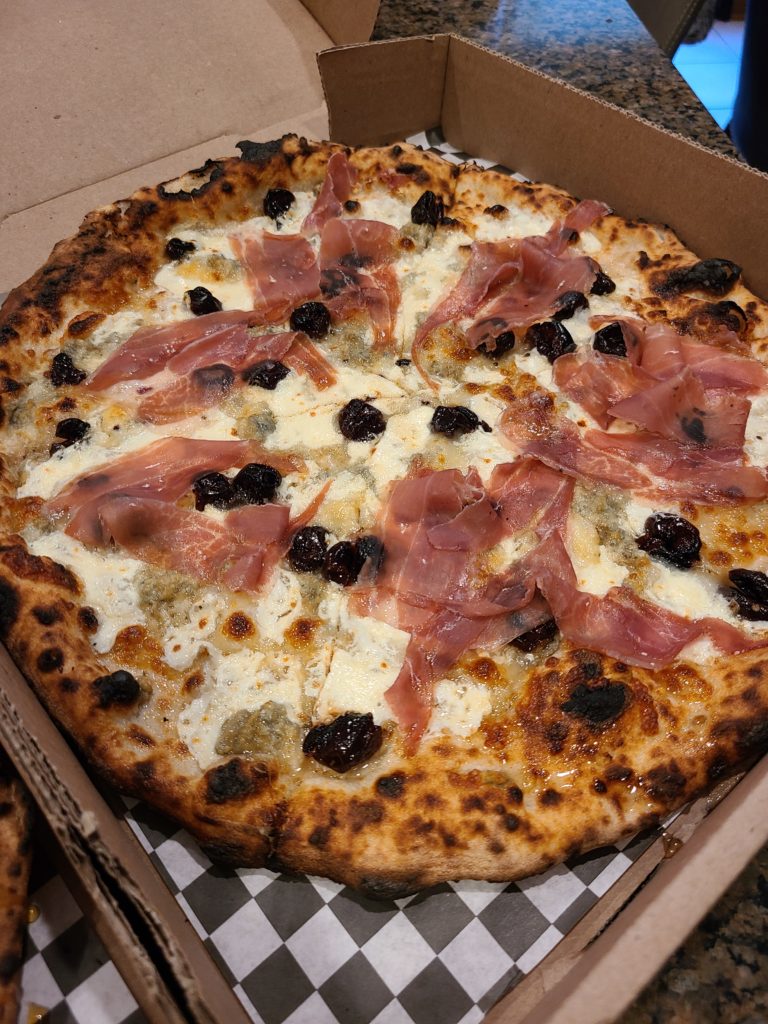 The Lady of the Farm selected the Cherry Jones, a smart move because she knows I don’t eat cherries, so I wouldn’t be stealing any of hers. Featuring Fresh Mozzarella, Gorgonzola, Speck, Dried Bing Cherries, and Orange Blossom Honey, it’s a summery pizza (never thought I’d use that phrase) and the orange blossom honey has some fun with the cherries, which aren’t overpowering. You may look at the above and say oh, they forgot to name prosciutto as an ingredient, but nope, that’s Speck. No worries, I too had to look up the difference and via Bon Appetit, speck is “rubbed down with a cure laced with spices like juniper and bay leaves. Then it is smoked and aged. That spiced cure gives speck a deeper taste that’s more intense than prosciutto di Parma.” The more you know. [caption id=“attachment_4774” align=“aligncenter” width=“768”]