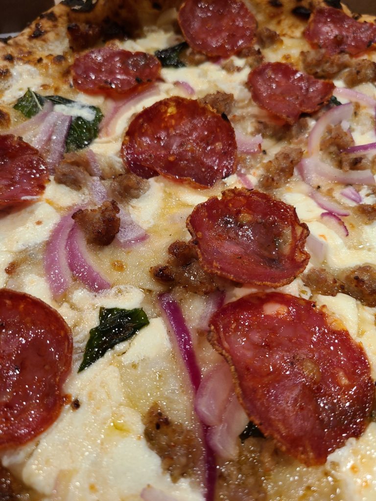 Hellified-do Hellified-don’t[/caption] We’d had this ‘za circled for a while. The Hellified Porkpie White, with Fresh Mozzarella, Hot Sopressata, Sweet Italian Fennel Sausage, Basil, Red Onion, Sliced Garlic, Mike’s Hot Honey Drizzle. Name sounds scary, the ingredient list not so much. The first thing to note is that this is a sticky pizza. Something happens with the “Mike’s Hot Honey” and it gets on all sides of the pizza. Top, back, underside, it’s all over, so no need to be dainty with it.
