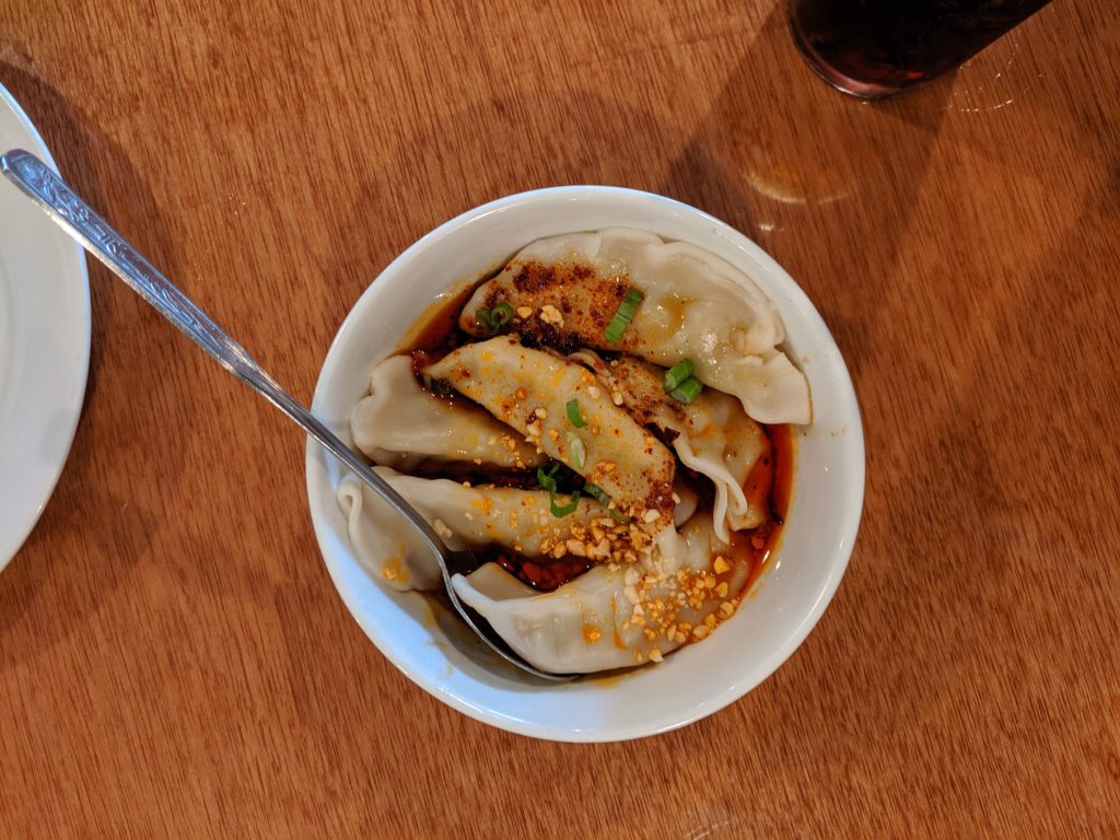 Presented in a wok over top of a flame, the Stir-Fried Cauliflower cooks a bit longer once it gets to your table. It is jam-packed with peppers, cauliflower and a soy glaze. Pepper-wise you have the standard dried cayenne-looking peppers, but this also added some jalapeños to the mix. The cauliflower is coated wonderfully and our server (who we believe may have been Helen herself, but did not verify) was quick to refill drinks for those of us that don’t tolerate spice as well. For newbies, this is an insanely spicy dish. For those used to some heat, this dish will still make you sweat. Myself, this dish makes you aware of the spiciness, but the flavor overwhelms any of the heat which I’m totally fine with. For this particular dish, we’ve placed it at #14 at the time of this writing. There are many wings and things spicier, but man, we will keep going back to Helen’s for this dish. One more thing about the Stir-Fried Cauliflower. We picked most of the cauliflower out, eating some of the other veggies along the way and were just going to leave the chiles. It was suggested that we take it home and use it with other dishes for flavor and heat. Later that evening we blended up the remainder (green onions, garlic, celery, remaining peppers), added some rice wine vinegar, additional garlic and a splash of water and used it with some shredded beef. The result was spectacular and we’re so glad it was suggested. We tried a few additional dishes while we were there including their spicy dumplings in chili oil.