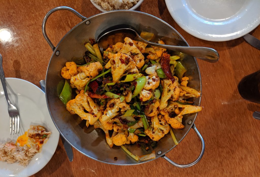 We are always on the lookout for new restaurants to add to our list and stumbled upon this gem after some friends suggested we go with them for the dumplings. What we found was an amazing smorgasbord of Chinese dishes, each with a great deal of flavor and a few with an awesome amount of heat. This particular evening the lady of the farm and I escorted the parents of the farm, also big fans of Chinese cuisine, to The Continent. Back in olden times The Continent was the place to be in Columbus. There were night clubs, stores, etc but now sadly it’s mostly rundown and dilapidated. Standing out like a diamond in the rough, and behind a Waffle House, you’ll find Helen’s Asian Kitchen, an unassuming building that is clearly a remodeled strip club (no judgements) with mirrors still included! The menu is broad, but there are some specialties in the front like Xiao Long Bao (hand made buns), Helen’s Hand-Made Dumpling (pork or vegetable) and what we decided to add to the list, the Stir-Fried Cauliflower.