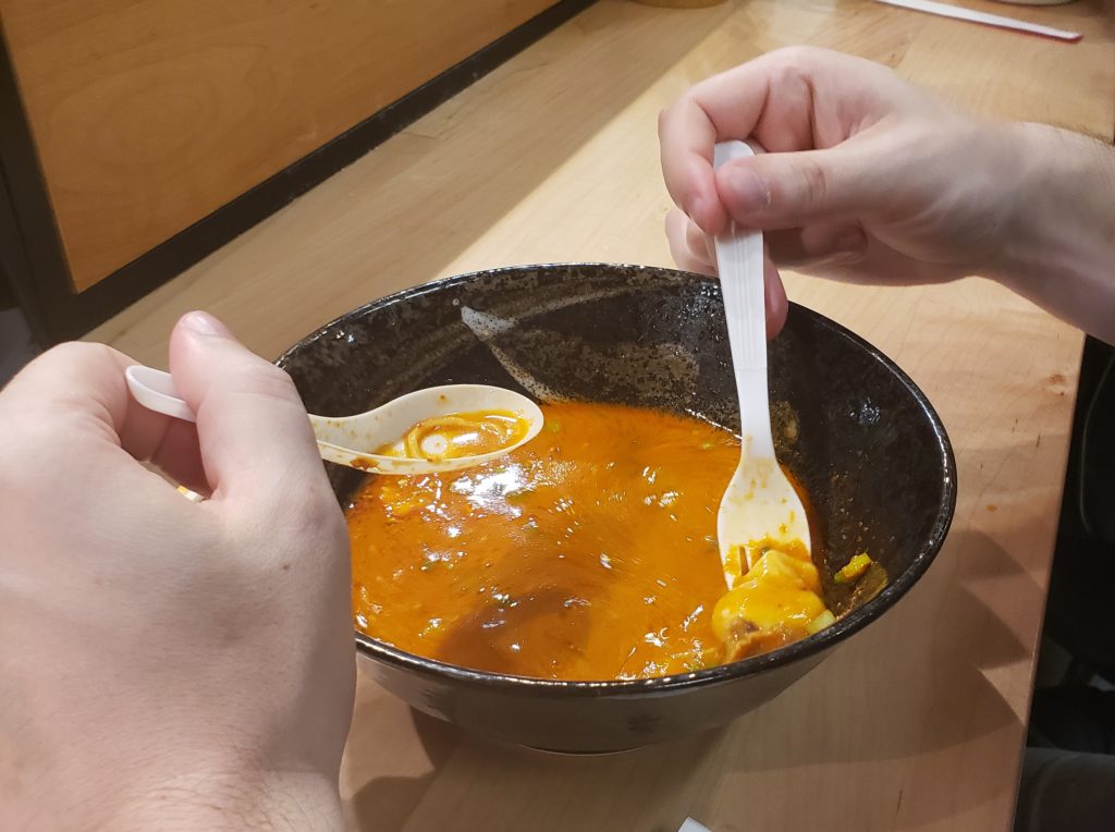 Can you spot the Reaper slices?[/caption] A bright red broth, with two large chunks of chicken, a non soft-boiled egg, noodles and slices of Carolina Reaper. Not even mixed in, just SLICES OF REAPER ON THE RAMEN (roughly 3/4 of a full reaper). This thing looked diabolical. I shook my head, knowing that this was going to be rough. I’d be lucky to make it out alive, let alone finishing the whole thing in 30 minutes (broth, toppings, everything must go!). The timer began and I took my first bites, trying to hide the Carolina Reaper inside bites of sprouts, egg and chicken. The chicken had a great cook with a nicely fried exterior that soaked up the broth. I made it through the Carolina Reaper slices and most toppings within four minutes. I was on my way. [caption id=“attachment_1211” align=“aligncenter” width=“1024”]