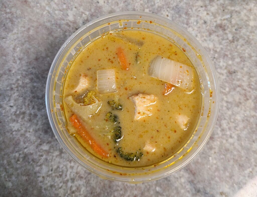 In tha bowl.[/caption] Is green curry or red curry spicier? Again, we’d likely have to try both from every spot in Columbus to get to some non-scientific conclusion, but for the purposes of this series, we will continue with green. Coming in at a 5 spice-level, the Green Curry is not spicy on smell alone. You get a major hit of the basil that is classic to green curries and a tiny vegetal whiff of the chilies used within. The Lady of the Farm watched from the other room, eyes barely creeping above the back of the couch as I prepped the dish. Carrots, onions, broccoli and chunks of chicken bathe in the curry, soaking up some of the flavors, while the rest got soaked up by the rice. [caption id=“attachment_3066” align=“aligncenter” width=“1024”]