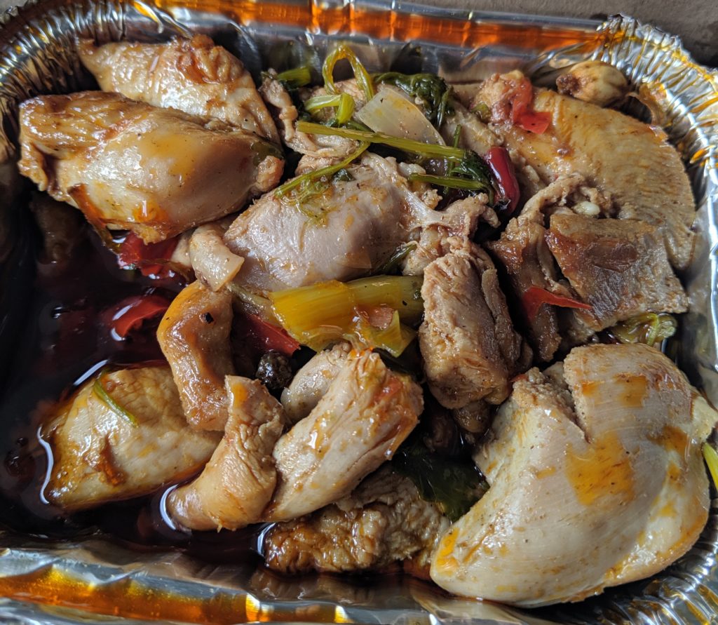 The first thing to notice is the little aluminum trays that these come in. All of it is packed neatly into a pizza box and handed to you for easy carryout (we’re not sure if it’s still in a box if you dine in). Packaging-wise this is super helpful if you end up not finishing all of your food in one sitting. No need to look for Tupperware, you’re covered. Just don’t put it in the microwave. In the above image, the Spicy Hop Chicken is the bottom right, which I decided to start with and then work my way up to the 3-pepper Szechuan Minced Chicken.