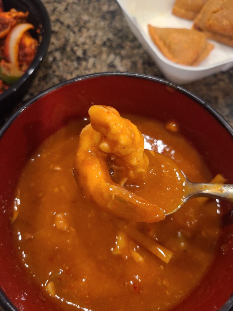 Spicy soup you say? I scoffed. Soup is not spicy. Hot & Sour soup? Sure, it’s got the illusion of heat, but it’s not spicy. Puffing my chest out as I walked into Tikka N Kebab, the kind woman at the counter remarked at my order. “You seem to like it pretty spicy.” “Keeps me warm during these Ohio winters!” She laughed, I laughed, the brown bag containing my food laughed. Once home and unbagged, I targeted the Extra Hot Chicken Tikka Kebab (it’s in the name, so of course I’ma try it). The spicy equivalent of the climate at Death Valley, the heat is dry and a bit higher than you’d expect, but overall I was underwhelmed at the 10/10 Extra Hot level. I sighed as I grabbed the soup container and threw the lid across the room. “Welp, here goes,” I whispered to the shrimps.