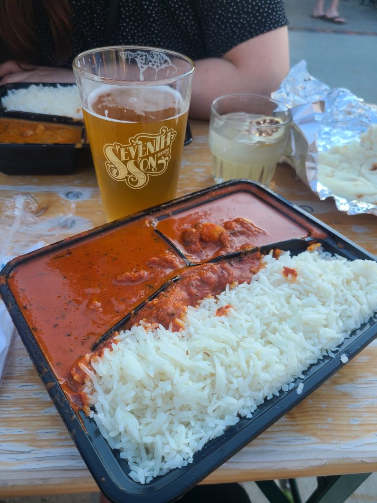 After some hot sauce deliveries on 614 Day, we wandered down to the Budd Dairy Food Hall/Seventh Son area because we were finally near Two Fatt Indians. Like two ships passing in the night, it seemed like we were always on opposite sides of Columbus but we finally did it. Sitting on the patio was definitely a weird feeling, being surrounded by other folks on a nice cool night, but I gotta say it’s super nice to be able to go out again. Two Fatt Indians has had a rough time during the pandemic, but I’m hoping they can come back strong as they’re able to get further out to breweries and high-traffic locations. With food trucks, catering, and delivery available, you’d be missing out if you don’t give Two Fatt Indians a try at some point. Their menu is packed with vegetarian, vegan, and traditional meat options as well as four different Biryani options. Each meal comes with a choice of 1-6 on the heat levels and is served with rice. The Lady of the Farm went with the Lamb Kasmiri Rogan Josh and some Naan, and wasn’t able to finish the full portion. While the initial $14-$17 price point may scare some away, the amount of food you get for that cost is worth it in our opinion.