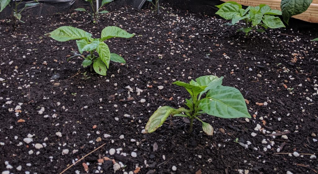 The Thai Chili plants from Oakland nursery are trying to bud already, but are still rather short, so we’ll be plucking those off for another week. As a test, we intentionally did not harden off a few plants. Below is a Yellow Moruga we didn’t harden off. Initially it was bleached by the sun and looked as pale as a ghosts underarms, but now has developed fresh growth that appears to be coming in pretty healthy.