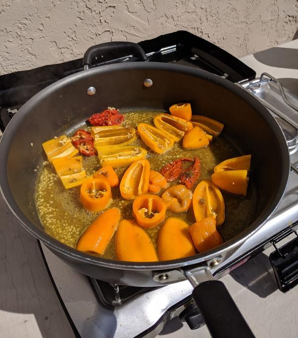 Put the whole thing on Love Lockdown and allow to simmer for five minutes so the peppers get nice and tender.