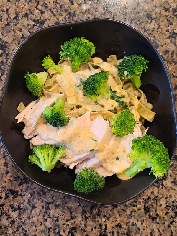 Featured here is the cajun alfredo sauce poured over some chicken, broccoli, and edamame pasta.