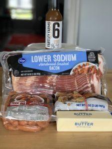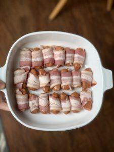 Paula Deen’s heaven[/caption] Get your oven going with a 375 degree preheat and get your bacon slices cut up into thirds. Wrap that beautiful fatty goodness around your tiny sausages (grow up) and place seam side down in your pan. [caption id=“attachment_2494” align=“aligncenter” width=“225”]