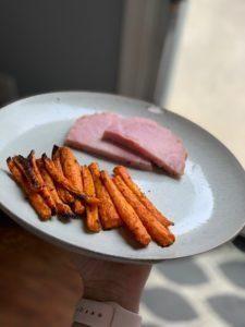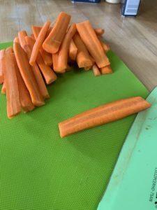 Grab your nearly over the hill carrots. Wash, peel and cut in half and then repeat the opposite direction. Spread out on baking sheet.