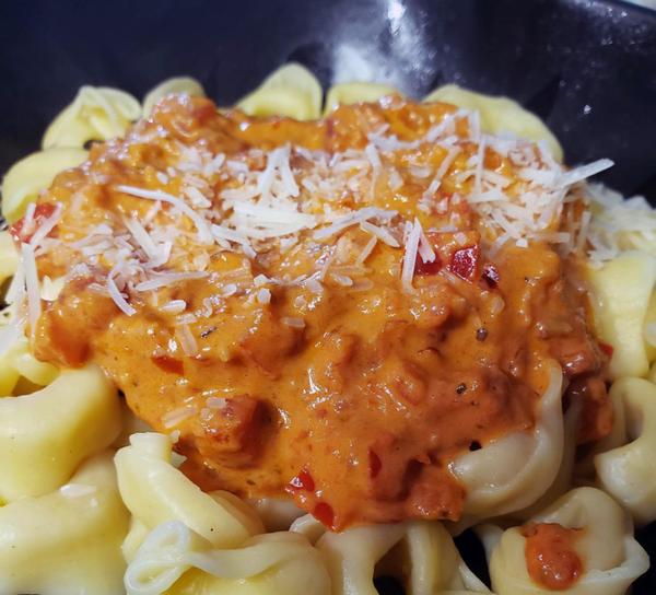 Other recipes don’t call for cream, but there was something missing when we got everything mixed and boiled together. We ended up taking the ingredients off the stove, blending on low pulse and then tossing back into the pan before adding the cream. It adds a thickness that helps, while taking a bit of the edge off the spice. If you don’t like tomato chunks (Ron hates big tomato chunks), definitely go the blending route.