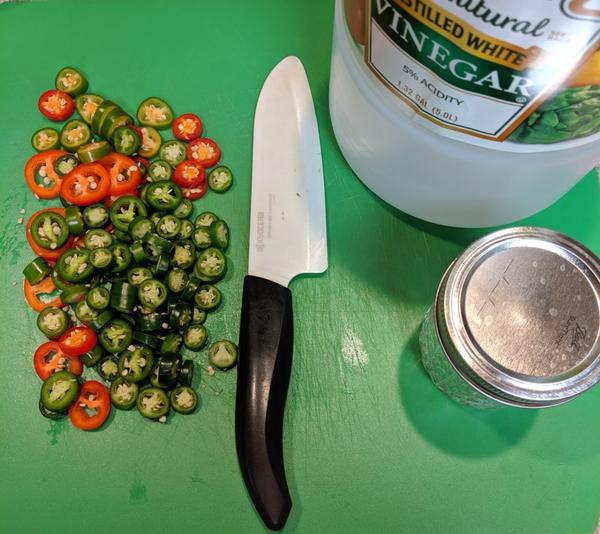 Pour vinegar over the peppers until it's roughly an inch higher than your peppers.
